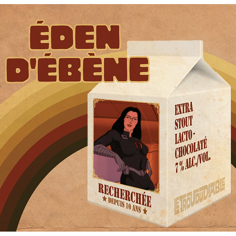 5e volet de la série 10 ans d’ancienneté, Éden d’Ébène fut brassé(e) afin de célébrer la décennie de Pascale Côté au sein du Trou du diable. Celle qui s’assure que nos colonnes balancent, a troqué, le temps d’une brasse, la calculatrice pour le fourquet. Inspirée par sa longue tignasse sombre, Pascale nous propose un Extra Stout lacto-chocolaté de couleur d’ébène dense aux reflets brunâtres. La mousse, aux allures de crème de moka, est accentuée par le service au robinet. D’abord, le parfum de cacao amère vous envoûtera avant de faire naître sur vos papilles une lancinante valse. S’en suivra un tango entre la liqueur de café sirupeuse et l’amertume du chocolat noir, assaillies subtilement par le fruit rouge, telle la rose que l’on tient entre les dents. En rideau final, le sucré se dévoile, offrant aux plus gourmands l’excuse de s’y retremper les lèvres. Espérons que votre palais saura apprécier ce nectar exceptionnel, tout autant que nous apprécions la présence réconfortante de cette femme d’exception, à l’humour contagieux.